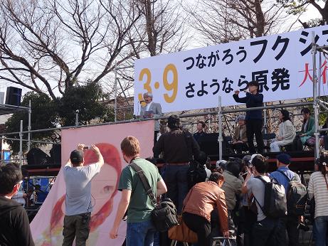 早くから原発問題を訴えてきた作家の広瀬隆さんは、地震発生や子どもたちの健康、生態系のの異変など、原発事故による恐怖の実態を指摘した後「原発を稼働させる方が多大な金がかかるということをマスコミはきちんと報道してほしい」と訴えました。また、集会参加のために来日した韓国の環境団体「韓国環境運動」の共同代表で「核なき世界のための共同行動」のチェ・ヨル代表が、国際的に連帯して脱原発をめざそうと呼びかけました。