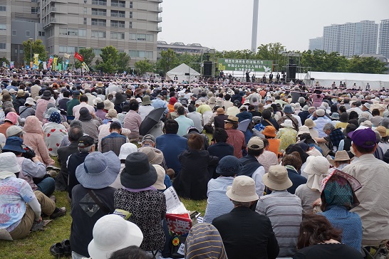また、焦点となっている沖縄・辺野古新基地建設について、沖縄平和運動センターの山城博治議長は「裁判所の和解勧告で工事は一時的に止まっているが、政府はまだ方針を変えておらず、現地は緊張の中、座り込みを続けている」と訴え、自ら作詞した「いまこそ立ち上がれ」を熱唱すると、壇上の発言者全員がスクラムを組み唱和しました。