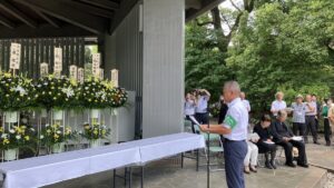 本日、終戦の日を迎えるにあたり、私たち一人ひとりが、戦争の悲惨さと平和の尊さを改めて深く心に刻み、世界中から争いが無くなることを願い、歴史の忘却を許さず、平和憲法の理念の下に世界の恒久平和の実現に向け、これからも不断の努力を続けていくことを堅くお誓い申し上げ、慰霊のことばといたします。