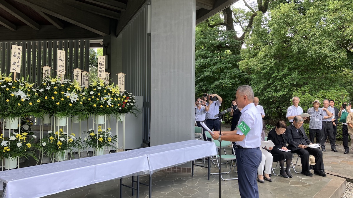 正午に黙とうを行い、平和フォーラムから染裕之・共同代表が「平和への誓いと慰霊のことば」(本記事下部に掲載)を捧げました。引き続いて、立憲民主党の阿部知子・衆議院議員、社会民主党の福島瑞穂・参議院議員、戦争をさせない1000人委員会の内田雅敏・事務局長がそれぞれ追悼のことばを述べました。その後、平和フォーラム構成団体代表および参加者が墓前に献花を行いました。