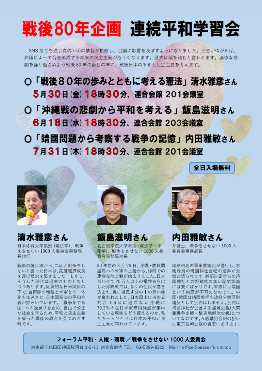 平和フォーラムは戦争をさせない1000人委員会との共催で、5月・6月・7月にかけ、戦後80年を迎えるにあたってのとりくみとして連続平和学習会を行います。ぜひご参加ください。