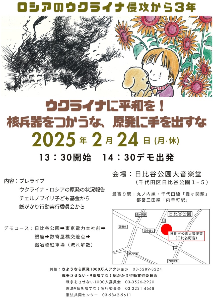 「戦争させない・9条壊すな!総がかり行動実行委員会」と「さようなら原発1000万人アクション」の共催で「ウクライナに平和を!核兵器をつかうな、原発に手を出すな集会」が2月24日(月・休)に日比谷公園大音楽堂(日比谷野音)にて行われます。