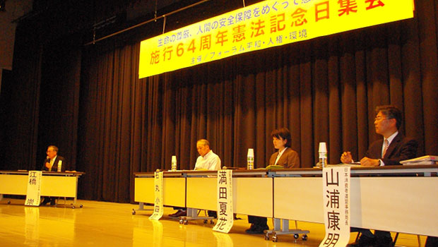 5月3日の憲法記念日、平和フォーラムは、施行64周年集会を開催。3月11日に起きた東日本大震災と福島第一原発事故という未曾有の事態を踏まえて、「安全に生きる権利」を主題としたシンポジウムを、40年にわたり福島で原発反対運動を続けてきた石丸小四郎・福島県双葉地方原発反対同盟代表、国際環境NGO「FoE(地球の友) Japan」の満田夏花さん、山浦康明・日本消費者連盟事務局長の3人のパネリストと江橋崇平和フォーラム代表のコーディネートで行いました。続いて自衛隊の改組を提案する「平和基本法」を提唱し、2008年、平和フォーラム編で同名書籍の中心執筆者である、軍事評論家の前田哲男さんが「人間の安全保障と平和基本法」と題して講演。最後に、藤本泰成平和フォーラム・原水禁事務局長が9月19日の明治公園での5万人集会をはじめ、持続可能で平和な社会(脱原発社会)に向けた取り組みについて提起しました。
