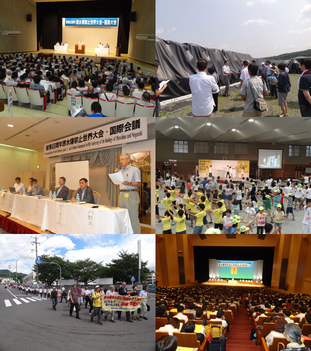 福島大会(上左、7月27日)、福島大会フィールドワークで除染廃棄物仮置き場視察(上右、7月28日)、 国際会議(中左、8月5日・広島)、メッセージfromヒロシマに参加した子ども達(中右、8月5日)、 非核平和行進(下左、8月9日・長崎)、長崎大会開会総会(下右、8月8日)