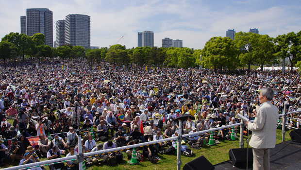 晴天のなか、広い会場は約3万人の市民で埋め尽くされ、大江健三郎さんは「安倍はアメリカで安保法制を進め、憲法を変えると言ったが、日本の人々は賛同していない。はっきりと声をあげていこう」と呼び掛けました。精神科医の香山リカさんは「時代は変わっても、平和は真理だ。今の憲法を使い尽くしていない。そんな政権に憲法に手をつける資格はない」と訴えました。