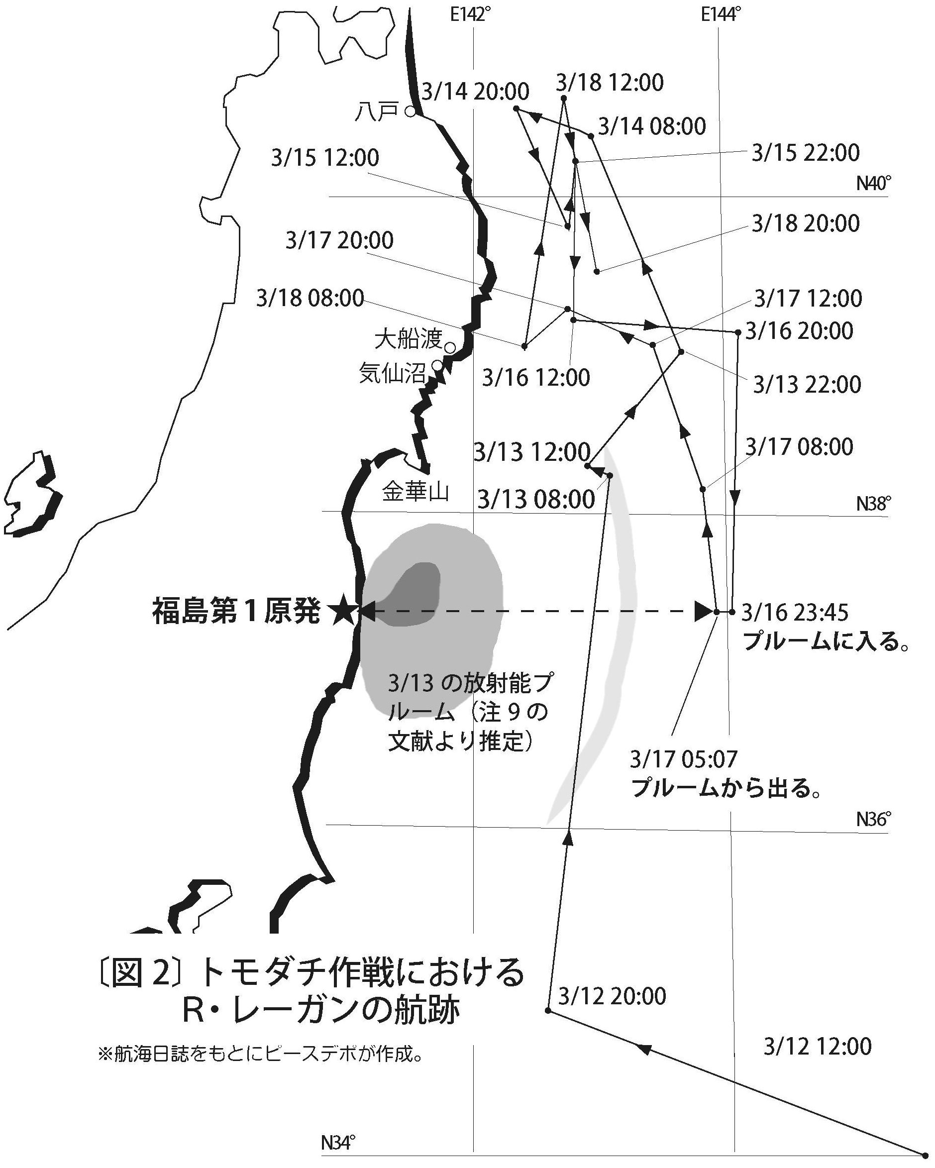 航海日誌に基づく3月12日からのRRの航跡を図2に示す。12日20時には千葉県勝浦沖に到達し、そこから半日かけて金華山沖に至る。この時、航海日誌に放射能に関連する記述はない。しかし米国防脅威削減局(DTRA)の報告書※3は、この日、RRは、福島原発から放出された放射能プルームを検知したとしている。同報告書から推定されたプルームの形状を図2に記入した。これが1回目の被曝である。13日にはすぐに、RR幹部も参加して、海上自衛隊「きりしま」艦上でOTに関する日米合同会議が開かれた※4。14日以降、同艦は、基本的に八戸沖から気仙沼沖辺りの三陸沖沿岸に停滞し、プラットホームとしての役割を担っていた。
