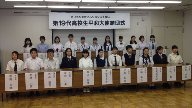 6月19日、広島市アステールプラザにおいて、第19代高校生平和大使の結団式が行われました(写真)。長崎にある高校生平和大使派遣委員会が中心となり、1998年より、被爆地の願いを世界に伝えるため、スイス・ジュネーブにある国連欧州本部に高校生平和大使を派遣しています。毎年応募者が増加する中、今年は15都道府県より22名が選出され、8月13日から20日まで欧州を訪問します。国連軍縮会議日本政府代表部への表敬訪問や、労働組合(UNI)本部、世界YWCAへの訪問交流、そして、国連軍縮局を訪問し、高校生一万人署名を提出して、核兵器廃絶のスピーチを行い、国連軍縮局長らと懇談をする予定です。今年も、外務省より「ユース非核特使」に委嘱されており、日本の若者を代表して、核兵器の廃絶と平和な世界の実現をうったえる姿は注目されています。