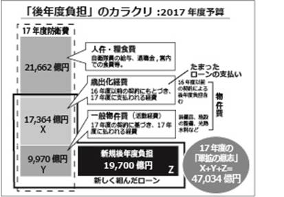 つまり、17年度予算には、見せかけよりもずっと多い、締めて<4兆7034億円>の軍備拡張の意志が反映されているのだ。この関係を示したのが下の図だ。この構造は、17年度予算案だけも眺めても見えてこない。図で言うX(1兆7364億円)については「もうこれだけは、決めてしまった分だから変えられてないからね」と政府は言っているのだ。