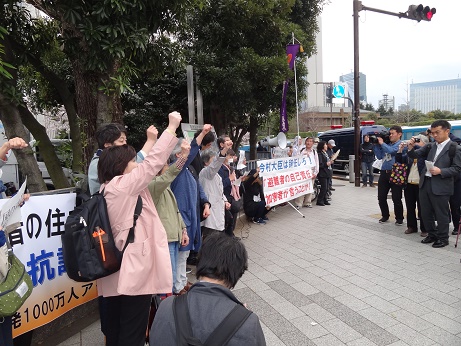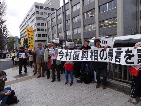4月5日に行われた記者会見で今村雅弘復興相は、記者から避難者が住宅提供を打ち切られ困窮していることに対する国の対応を問われて、「本人の責任だ。裁判でも何でもやれば良い」と言ったことに対し、さようなら原発1000万人アクション実行委員会と、「避難の協同センター」(福島からの避難者と支援者の団体)は、6日に官邸前で「被災者を切り捨てる今村復興相の暴言を許さない!緊急抗議行動」を行い、避難者や市民など200人が集まりました。