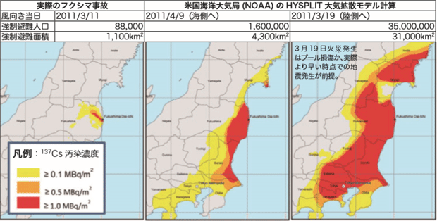 米国科学アカデミー(NAS)は福島事故の教訓について二つの報告書を出しています。二つ目の報告書(2016年5月)は、4号炉の使用済み燃料貯蔵プールで発生が心配された火災に焦点を当てました。同報告書の執筆メンバーの一人、プリンストン大学のフランク・フォンヒッペル名誉教授は、放射性物質の大気拡散研究者ミハエル・シェプナー博士とこの問題をさらに掘り下げる研究結果を同年11月に発表しました(『科学と世界安全保障』誌)。同論文は、偶然の出来事で免れたプール火災が実際に起きていたら、風向きによっては3500万人が強制避難させられていた可能性があることを示しています。海向きの風でも1600万人が強制避難という結果です。(下図。1.0MBq/m2は福島の強制避難レベル)