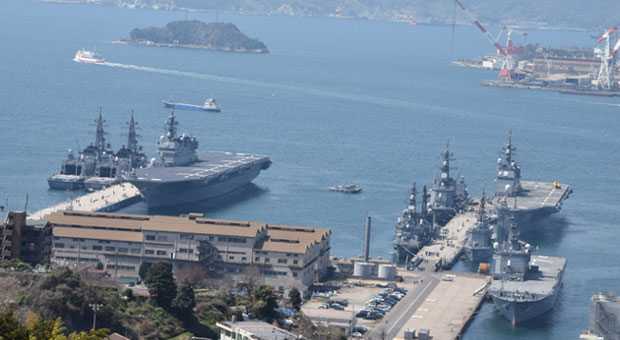 全通甲板の大型艦船がひしめく海上自衛隊呉基地。左側のFバースにヘリ空母「かが」、