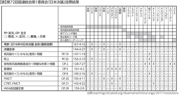 17年10月27日、第72回国連総会第1委員会(軍縮)で日本ほか46か国を共同提案国とする決議案L.35「核兵器の全面的廃絶に向けた、新たな決意のもとでの結束した行動」いわゆる日本決議が採択された。過去20年以上にわたり毎年、提出されている本決議は、日本の核兵器政策を占う上で重要な指標となるものだが、人道イニシャチブによる核兵器禁止条約(TPNW)が7月7日に締結され、9月20日に署名解放された後に提出される初めての決議案という重要な節目の決議案となることから、今後に向けて重要な意味を有している。まずTPNWに言及していないため、禁止条約に積極的な国は多くが棄権に回るという予測があった。その意味では棄権は予想されたほど多くはなかった。禁止条約に言及しなかったことは大問題だが、過去の核不拡散条約(以下、NPT)合意すら後退させようとする試みが露呈した。ここには今後の日本政府の針路にとって深刻な問題が含まれている