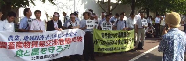 フォーラム平和・人権・環境は、全国農民組織連絡会議、日本消費者連盟などとともに、8月6日、オーストラリアとの自由貿易協定(FTA)の交渉等に対する生産者・消費者緊急行動を行いました。 当日から、オーストラリアとのFTAの政府間交渉が行われたことに対して、農産物輸入自由化に反対して行ったもので、全国から約100人が参加しました。 衆議院議員会館で意思統一のための集会が開かれ、平和フォーラムの小林照明副代表などがあいさつ、 また、食品関連労組で構成するフード連合の代表も、「輸入で国内農業が壊滅すると、食品産業にも大きな打撃がある」と訴えました。 活動の経過として、600近くの自治体議会の意見書を獲得したことや、日豪の市民団体によるFTA反対の共同声明に100を超える団体から賛同が寄せられていることなどが報告され、 集会決議を採択して、直ちに行動に移りました。 行動は、日豪政府間交渉が行われた外務省前と、農水省前に集結し、北海道など各地の参加者の訴えやアピール行動を行いました(写真)。 さらに、外務省と農水省への代表要請も行いました。なお、次回の政府間交渉は11月上旬にオーストラリアで開かれます。