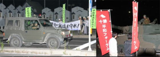 陸上自衛隊第5旅団(司令部・帯広)は8月31日未明に引き続き、9月12日未明にも戦車の公道自走を行いました。 戦車5両は9月9日に行われた「旅団創立記念日」に展示するため、鹿追駐屯地から帯広駐屯地までの公道約45キロを車両16台、戦車5台は自走しました。 橋りょうでは時速10キロ以下で走行することになっていたものの、往路の一部の橋りょうでは10キロを超える速度で自走し、 道路管理者の帯広土現から注意を受けました。復路では、旅団は「制限速度を守った」言っています。 平和運動フォーラム十勝や市民団体は、自走する公道の沿道で、「横断幕、のぼり旗」などを掲げ、中止の抗議行動を実施しました。 現地は「住宅街」のため、騒音問題あり、3年連続となる、「戦車の公道自走」に問題があるとし、 「戦争に使用される軍事車両である戦車を公道を自走することは、多くの市民への不安を与え、日常生活を脅かすもので、断じて許すことは出来ない」 と中止の申し入れをしてきました。こうした軍事訓練がなし崩し的に行われることを防ぐためにも、引き続き抗議の行動を展開していくことを確認しました。