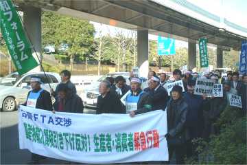 2月25日に、同日から外務省内で行われている、日本とオーストラリアとの貿易自由化(FTA)交渉に対し、農産物の関税引き下げに反対して、 平和フォーラムは生産者や消費者団体とともに、「日豪FTA交渉 農産物輸入関税引き下げ反対!生産者・消費者緊急行動」を行いました。 社会文化会館で開かれた集会に全国から200人が参加し、主催者あいさつで平和フォーラムの小林照明副代表は 「今日からの交渉で、牛肉、小麦、砂糖などの農産物の関税撤廃を豪州側は求めてくる。これを許せば、日本農業は壊滅的打撃を受ける。 食料の安定・安全のためにも、日豪FTA交渉から農産物を外すよう求めていこう」と訴えました。 民主党や社民党の代表の決意表明などを受け、集会決議を採択。 直ちに、デモ行進に移り、国会前で「日本の食料・農業を守ろう!」などとシュプレヒコールをあげ、政党への請願を行いました。 また、農水省や外務省への要請活動、農水省前での街頭アピール行動など、多彩な活動に取り組みました。  →集会決議