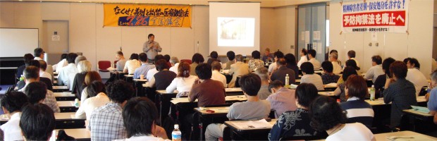 2003年7月に衆参両院の強行採決で成立され、2005年7月から施行された「心神喪失者等医療観察法」は、誰にも予測できない「再犯のおそれ」を理由に無期限に人を拘束し自由を奪う予防拘禁法。制定前から内外の精神障害者当事者組織、障害者団体、日弁連や平和フォーラムが、憲法、近代刑法の原則、国際人権規約などに抵触する人権侵害法として反対しました。現在、施行から4年を経ましたたが、すでに872人(2008年8月末)が強制医療下に置かれ、政府が認めただけでも12名が自殺に追い込まれるなど、さまざまな問題が引き起こされています。年内には批准されようとしている障害者権利条約は、すべての障害のある人は「その心身がそのままの状態で尊重される権利を有する」と定め「いかなる場合においても自由のはく害が障害の存在によって正当化されないこと」と定めています。2010年の医療観察法「見直し」を前に、医療観察法の現状を正しく検証し、差別と拘禁の法をなくそうと、7月26日に東京池袋の東京芸術劇場に全国から約120人の参加者を得て、「なくせ!差別と拘禁の医療観察法7.26全国集会」が開かれました。
