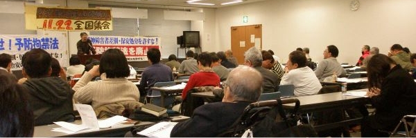 2003年7月に衆参両院の強行採決で成立され、2005年7月から施行された「心神喪失者等医療観察法」は、誰にも予測できない「再犯のおそれ」を理由に無期限に人を拘束し自由を奪う予防拘禁法。制定前から内外の精神障害者当事者組織、障害者団体、日弁連や平和フォーラムが、憲法、近代刑法の原則、国際人権規約などに抵触する人権侵害法として反対しました。現在、施行から4年を経ましたたが、すでに872人(2008年8月末)が強制医療下に置かれ、政府が認めただけでも13名が自殺に追い込まれるなど、さまざまな問題が引き起こされています。批准間近いとされる障害者権利条約には、すべての障害のある人は「その心身がそのままの状態で尊重される権利を有する」と定め「いかなる場合においても自由のはく害が障害の存在によって正当化されないこと」と定めています。また、この法律に反対した民主党、社民党などによる新政権が誕生した今こそ、2010年の医療観察法「見直し」にあたって、医療観察法の現状を正しく検証し、差別と拘禁の法をなくそうと、11月12日に東京南部労政会館に全国から76人の参加者を得て、「差別と拘禁の医療観察法の廃止を!全国集会」が開かれました。