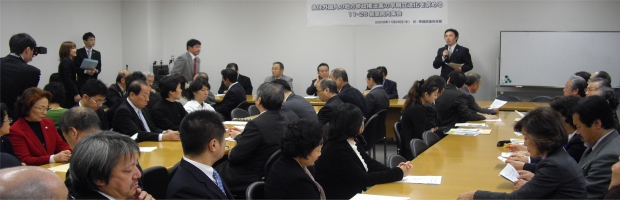 外国籍住民は当然地域社会を構成している一員であり、地域社会の発展に応分の寄与をしています。外国籍住民の基本的人権を保障し、差別のない共生社会実現のためにも、地方参政権は必要不可欠です。民主党を中心とした連立内閣へと政権交代が起こり、第173回臨時国会への永住外国人の地方参政権付与法案の提出が取りざたされたなか、一刻も早く永住外国人の地方参政権を確立しようと、11月26日、衆議院第1議員会館で、定住外国人の地方参政権を実現させる日・韓・在日ネットワーク、在日本大韓民国青年会中央本部、民団東京本部の主催で「永住外国人の地方参政権法案の早期立法化を求める11・26緊急院内集会」が行われ、100人以上が参加しました。集会には民主党から、末松義規・渡辺浩一郎・手塚仁雄・初鹿明博の衆議院議員、白眞勲・小川敏夫の参議院議員、社民党から近藤正道参議院議員、公明党から魚住裕一郎・鰐淵洋子の参議院議員、共産党から笠井亮衆議院議員の10人の国会議員が出席しました。