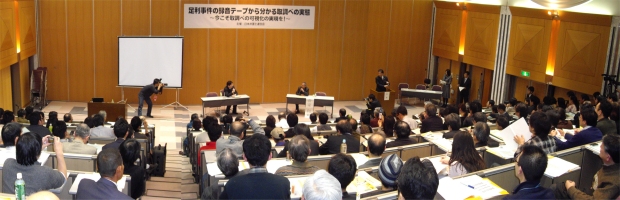 これを受けて、日本弁護士連合会は1月27日、取調べ全過程の録音・録画(可視化)の実現に向けた市民集会を東京の弁護士会館で開き、法曹関係者や市民の関心も高く会場ほぼ満席の約250名が参加しました。