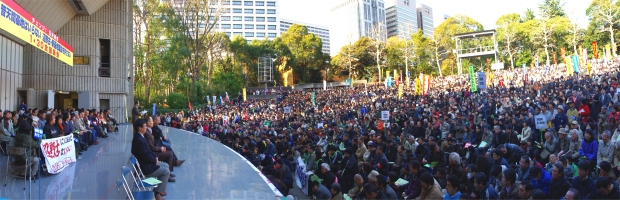 1月30日、「チェンジ!日米関係 普天間基地はいらない 辺野古・新基地建設を許さない1・30集会」が 東京・日比谷野外大音楽堂で開催されました。 主催は、フォーラム平和・人権・環境や「辺野古への基地建設を許さない実行委員会」などで構成された実行委員会。WORLD PEACE NOWが協賛しました。鳩山政権が普天間基地返還問題で自公政権下の合意案を見直し5月までに結論とするなか、1月24日の名護市長選挙で稲嶺進さんが当選するなど、地元沖縄の辺野古新基地建設に明確に「NO」の声を示しています。この集会は東京でも市民の声をあげようというものです。集会には、沖縄からかけつけ演壇に上がった100名以上をはじめ参加者は6000人を超え、満員の会場からあふれて入れない人が周辺で待機する状態となりました。