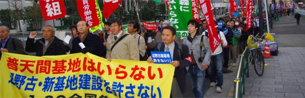 集会は、藤本泰成平和フォーラム事務局長の主催者あいさつ、内閣府特命担当大臣でもある社民党党首の福島みずほ参議院議員、民主党の斎藤つよし衆議院議員の国会情勢報告と参加国会議員の紹介につづいて、沖縄からの報告として山城博治沖縄平和運動センター事務局長、安次富浩ヘリ基地反対協共同代表、伊佐真次「ヘリパットいらない」住民の会共同代表からの提起と訴えののち、名護市長選挙で当選した稲嶺進さんのメッセージが紹介され、神田公司合志市議会議員と井原勝介前岩国市長の連帯のアピール、集会決議をWORLD PEACE NOWの土井登美江さんが提案・拍手で採択し、プラカードをかかげてシュプレヒコールを行い、太田武二新運転書記長の三線と唄「沖縄を返せ」で銀座へのデモ行進に出発しました。