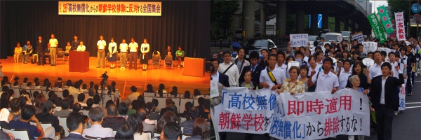 文部科学省は、高校無償化を朝鮮学校に適用するかどうかは教育の問題であり、外交問題や「拉致」とは関係ないと言ってきましたが、8月末、民主党が政調会で討論するとし、適用妥当の検討結果はひきのばされてきました。すでに成立した「高校無償化」法のもとに、31の外国人学校がすでに適用対象とされているにもかかわらず、朝鮮学校に適用しないのは明らかな差別です。外交問題を含めることは、これまでの文科省の説明と矛盾するとともに、政治的理由で朝鮮学校を差別することは民主党が排外主義の先頭に立つこで許せないとの立場から、9月26日、高校生、保護者、日本の市民、平和フォーラムを含む約250の賛同団体のもと、東京・社会文化会館で「高校無償化」からの朝鮮学校排除に反対する全国集会が開かれ、屋内集会には約1000人、その後のデモには約1500人の参加者を得て行われました。