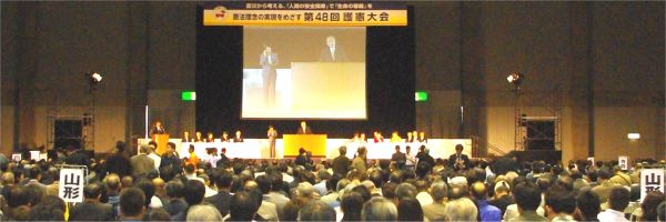 世界規模の不況と「格差と貧困」の広がりに加えて、3月11日の東日本大震災の未曾有の自然災害と東京電力福島第一原子力発電所事故という歴史的事態による深刻な被害を受けながら、その復興に向けて懸命にとりくんでいる東北は山形の地で、「震災から考える、『人間の安全保障』で『生命の尊厳』を 憲法理念の実現をめざす第48回大会」を正式名称に、山形県山形市のビッグウィング多目的展示場をメイン会場として11月4日から6日までの日程で第48回護憲大会が開催されました。全国47都道府県持ち回りで行われる護憲大会の、山形県での開催は初めてで、36番目の開催県となりました。