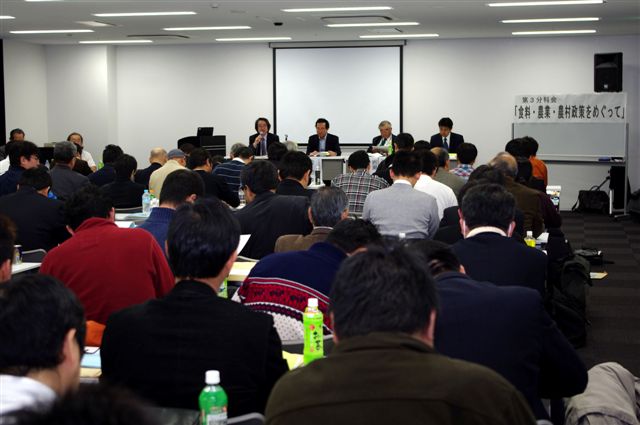 日本農業新聞記者の金哲洙さんは、韓国で韓米FTA交渉の批准が強行採決された状況を取材したことを中心に報告した。韓国の国会では、催涙弾が投げられるなどの混乱の中で、FTA批准の強行採決が行われたが、それに反対してデモなどが行われている。その先頭に政党が立っていることや、若者のデモ参加者が多いことなど、日本との違いも指摘した。また、農業は、自然や地域に調和して成り立つものであり、単に経済効率だけで市場開放をしていいものではない点も強調した。
