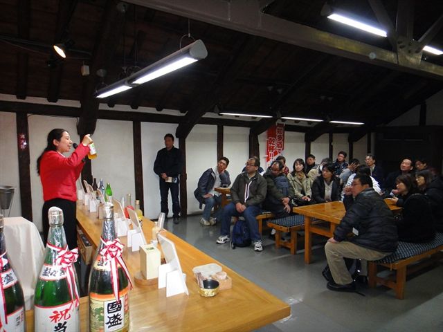 半田駅から歩いて10分ほどの「酒の文化館」(中埜酒造併設施設)では、ガイドから半田地域の酒造業は、江戸時代に尾張藩の積極的な奨励があったこと、主要流通手段であった海運の便に恵まれ江戸にまで大量に運ばれたことから、かつては灘に次ぐ2番目の大産地であったと説明を受け、その後、江戸時代からの酒造りの道具・製法を見学した。