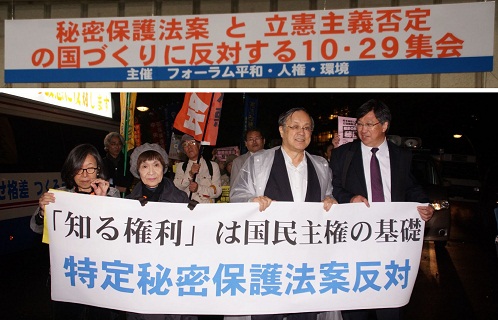 10月29日の夜、平和フォーラムは東京・日比谷野外音楽堂で「秘密保護法案と立憲主義否定の国づくりに反対する集会」を開き、市民や労働組合の代表など2800人が参加しました。10月25日に安倍内閣は「特定秘密保護法案」を閣議決定し、臨時国会に提出しました。しかし、これは市民の「知る権利」を制限し、「戦争の出来る国づくり」を進めようとしていることから、世論調査でも反対の声が多くなっています。