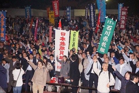 社民党の党首の吉田忠智さんも「安倍首相は戦争の出来る軍事大国化をめざしている。憲法96条の改憲を許さなかったっ闘いをさらに広げていこう」と訴えました。さらに、立憲フォーラム幹事長の辻元清美・衆議院議員は「何を秘密にするかを内閣で決めて、国権の最高機関の国会に対しても明らかにしないのは、国会議員がなめられていることだ。立憲主義を守るためにがんばる」と述べました。