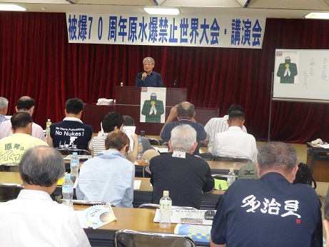 原爆や東日本大震災の犠牲者などに黙とうをささげた後、主催者を代表し、川野浩一・大会実行委員長(原水禁議長)は、自ら長崎で被爆した経験をもとに「国家による原発被害に対する補償を明確にさせなければならない」と指摘、さらに「事故にも関わらず原発再稼働をめざし、さらに戦争法案を成立させようとする安倍政権に反対し、断固として平和を守ろう」と訴えました。