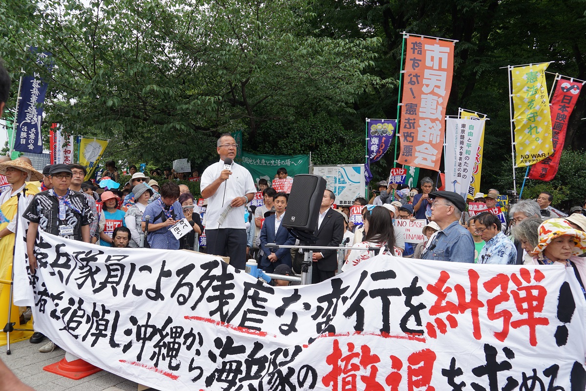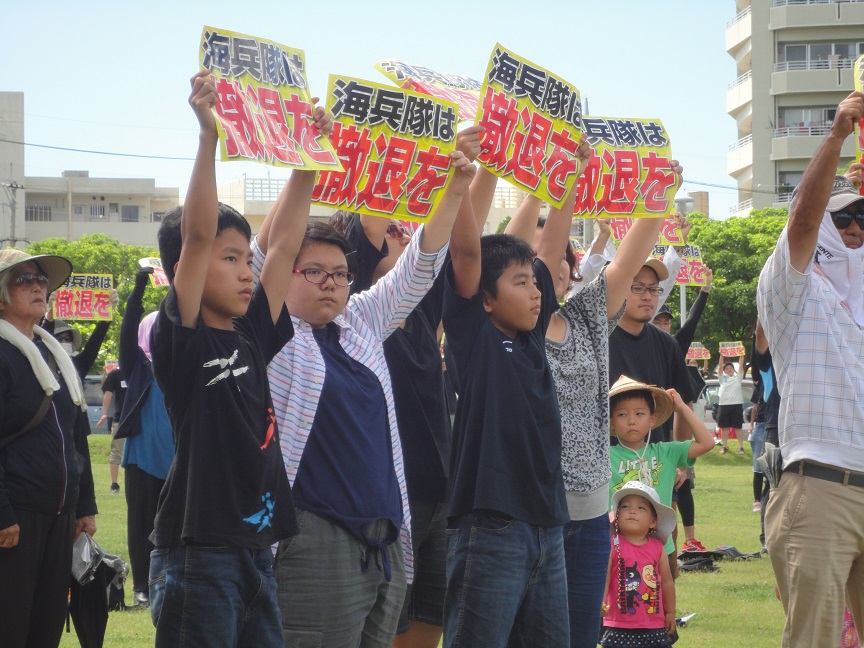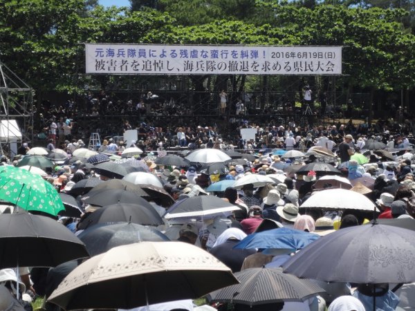 梅雨明け直後の炎天下のなか、古謝美佐子さんが『童神』(わらびがみ)を静かに歌い上げるところから県民大会は始まり、元米海兵隊で米軍属による残虐な事件の被害にあわれた女性を追悼し、参加者全員で黙とうをささげると、怒りと悲しみが静寂のなかに広がりました。オール沖縄共同代表の高里鈴代さんが、被害女性の父親から、「次の被害者を出さないためにも、全基地撤去、辺野古新基地建設に反対」などと訴えるメッセージを代読しました。名桜大の学生の玉城愛さんは、「女性の命がうばわれた。もしかしたら私だったかもしれない」と語り、「生きる尊厳と生きる時間が、軍隊によって否定される。命を奪うことが正当化される」と軍隊の構造的暴力について批判しました。大会の最後に翁長県知事が登壇し、うちなーぐちで「みなさん、負けてはいけませんよ。私たち県民の子や孫たちを守っていきましょう。がんばっていきましょう」と呼びかけると、会場からは大きな拍手が沸き上がりました。米海兵隊の撤退や地位協定の抜本的な改定を求める大会決議を採択した後、参加者は『怒りは限界を超えた』『海兵隊は撤退を』と書かれたプラカードを掲げ、アピールしました。