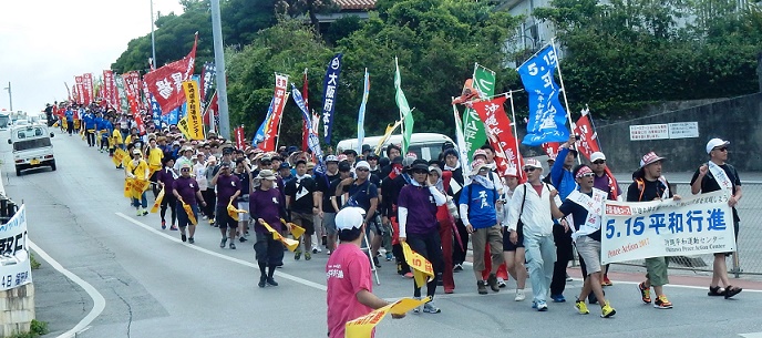 日本に復帰して45年を迎える沖縄で、5月11日から14日までの4日間、「第40回5・15平和行進」が開催されました。沖縄県民にとって「屈辱の日」であるサンフランシスコ講話条約が発効した1952年4月28日から65年、沖縄が日本へ復帰した1972年5月15日から45年目を迎え、節目の今年の行進には沖縄県内・全国から延べ5370人が参加しました。(上写真)