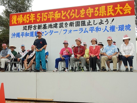 最終日の14日、両コースの平和行進団は、名護市瀬嵩海岸に結集し、「復帰45年 5・15平和とくらしを守る県民大会」(参加者2000人)が開催されました。県民大会では、日米両政府によって推し進められる米軍、自衛隊基地の強化・拡大に反対し、米軍関係者による凶悪犯罪を糾弾、日米地位協定の抜本的改正、アジアをはじめ世界平和のために闘い抜くことを基調とする大会宣言を全体で確認しました。(下写真、あいさつをする山城博治・沖縄平和運動センター議長)