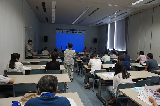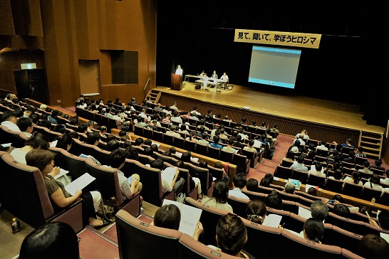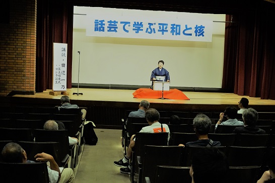 午後からは様々なグループが企画した「ひろば」や「つどい」が開かれた他、落語や講談で平和や核問題を学ぶ「話芸のひろば」(写真上)や、映画の上映会も行われました。さらに、子どもや若者にも平和の問題を知ってもらおうと、今年も「子どものひろば」や、高校生が企画した「メッセージfromヒロシマ」も行われました。また、フィールドワークは、一部台風の影響で中止せざるをえない催しもありましたが、様々な現場を視察しました。