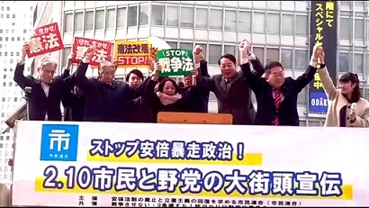 市民連合(安保関連法の廃止と立憲主義の回復をめざす市民連合)と「戦争させない・9条壊すな!総がかり行動実行委員会」との共催で、2月10日、東京の新宿駅西口で「市民と野党の大街頭宣伝」を実施しました(上写真は登壇者)。