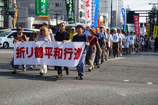 毎年、最初の行動は「折鶴平和行進」。全国を回った「非核平和行進」を受けて、平和公園原爆資料館前に集まった全国の参加者は、横断幕を先頭に、のぼり旗などを持ちながら広島市内を行進。子ども連れの参加者も目立ち、「核兵器を廃絶しよう!」「原発の再稼働は許さない!」「被爆者の支援を!」などと、炎天下にもかかわらず、コールを繰り返しながら、県立総合体育館まで元気に歩きました。