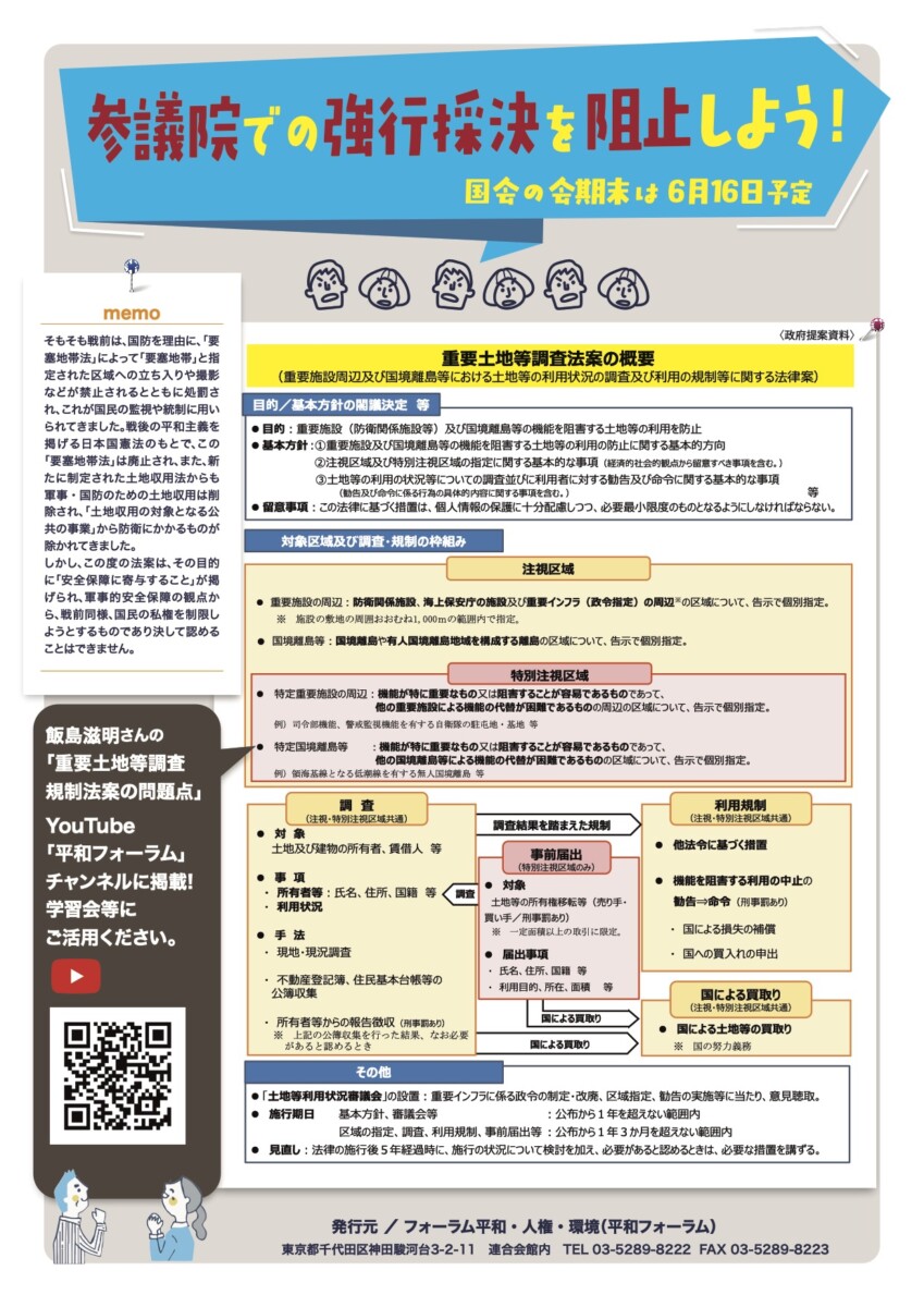 チラシ「重要土地調査規制法案の廃案を!」を作成しましたので、ここにご案内します。このチラシを活用していただき、「重要土地調査規制法案」の廃案を求めるとりくみをよりいっそう拡げていただけますと幸いです。