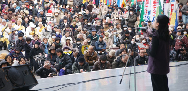 12月10日、東京・日比谷野外音楽堂を会場に、「がんばろう!さようなら原発1000万人署名」集会とデモが開催され、約5,500人が参加しました。この集会は、現在とりくんでいる「さようなら原発1000万人署名」の達成を呼びかけるために企画されたもので、呼びかけ人の大江健三郎さん、鎌田慧さんらが署名の拡大に向けて訴えました。集会後のパレードには、若い方から年配の方まで多様な人々が脱原発を訴えて、解散地点の常盤橋公園まで元気よく歩きました。また、集会の前にはJR有楽町駅前で街頭署名が行われ、買い物客でにぎわう中、多くの人が足を止めて署名に応じてくれました。写真は、集会で発言するハイロアクション福島原発の大賀あや子さん。(写真提供:今井明さん)。