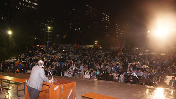 安倍政権の集団的自衛権の行使に反対し戦争への暴走を阻止しようと、3月に結成された「戦争をさせない1000人委員会」の出発集会が、3月20日、東京・日比谷野外音楽堂で開かれ、雨の中にもかかわらず4000人が参加しました。開会あいさつに立ったルポライターの鎌田慧さんは「全国の地域で『1000人委員会』を結成し、戦争をさせないための集会を網の目のように組織してほしい」と運動の拡大を訴え、作家の大江健三郎さんは、敗戦時に母親が「次の世代を担う子どもたちは、生き方を変えることができる」と語ったことを紹介し、「平和憲法を持ちこたえて、明日の生き方を作りだそう」と呼び掛けました。(写真)