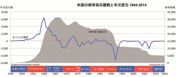 「米国科学者連合(FAS)」のハンス・クリステンセン氏が10月15日のブログに載せた下のグラフを見てみましょう。灰色の部分が、米国の保有核数の歴史的水位を、折れ線が各年の増減数を示しています。右に示したのは同氏のデータを使って冷戦後の政権毎の削減数を棒グラフにしたものです。前政権から引き継いだ核兵器を何%減らしたかを示す数字を見ても、冷戦後の4人の大統領は就任順にそれぞれ41%、23%、50%、10%となっており、オバマ大統領の成績は振るいません。クリステンセン氏が指摘している通り、保守的な米国議会、核削減交渉を拒絶するロシアのウラジーミル・プーチン大統領、米国内の核兵器関連組織の抵抗などに直面した結果なので大統領だけを責めることはできませんが、皮肉な結果となっています。