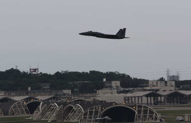 安倍政権は、危険なオスプレイの飛行訓練について、米軍の運用には関知せずの態度を改めて、米軍と実質的な協議をするべきです。〈写真は、飛行訓練の増大で爆音被害が続く沖縄・嘉手納基地〉