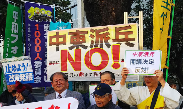 日本が米国と一体となって「戦争ができる国」へと進むことを許さず、自衛隊員が「普通の国の軍隊」のように他国に派遣され、殺し殺される関係の中に入っていくことは何としても阻止しなければなりません。(写真は2019年12月27日早朝、首相官邸前で閣議決定に抗議する行動)