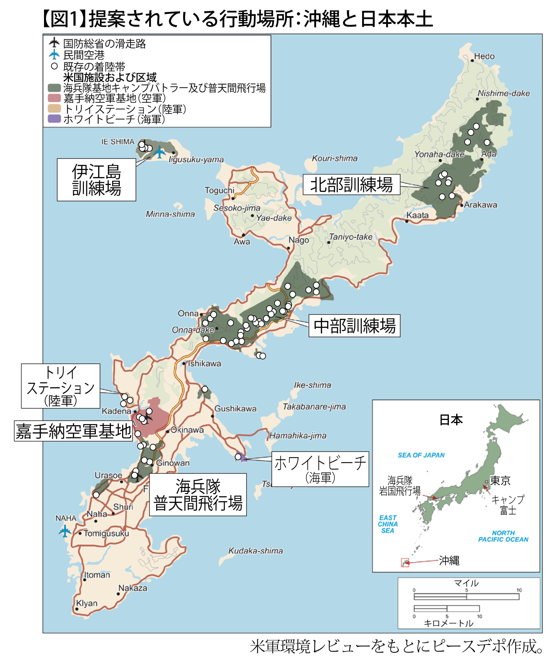 「要約」の1ページ目に掲載されている沖縄本島周辺地図を<図1>に示す。ここには、オスプレイの運用場所として、既存の69か所のヘリパッド(ヘリコプター着陸帯)が示されている。普天間を起点として、本島中北部に位置する、嘉手納飛行場、ホワイト・ビーチ、キャンプ・ハンセン、キャンプ・シュワブ、北部訓練場、伊江島へも頻繁に飛行するであろうことがわかる。