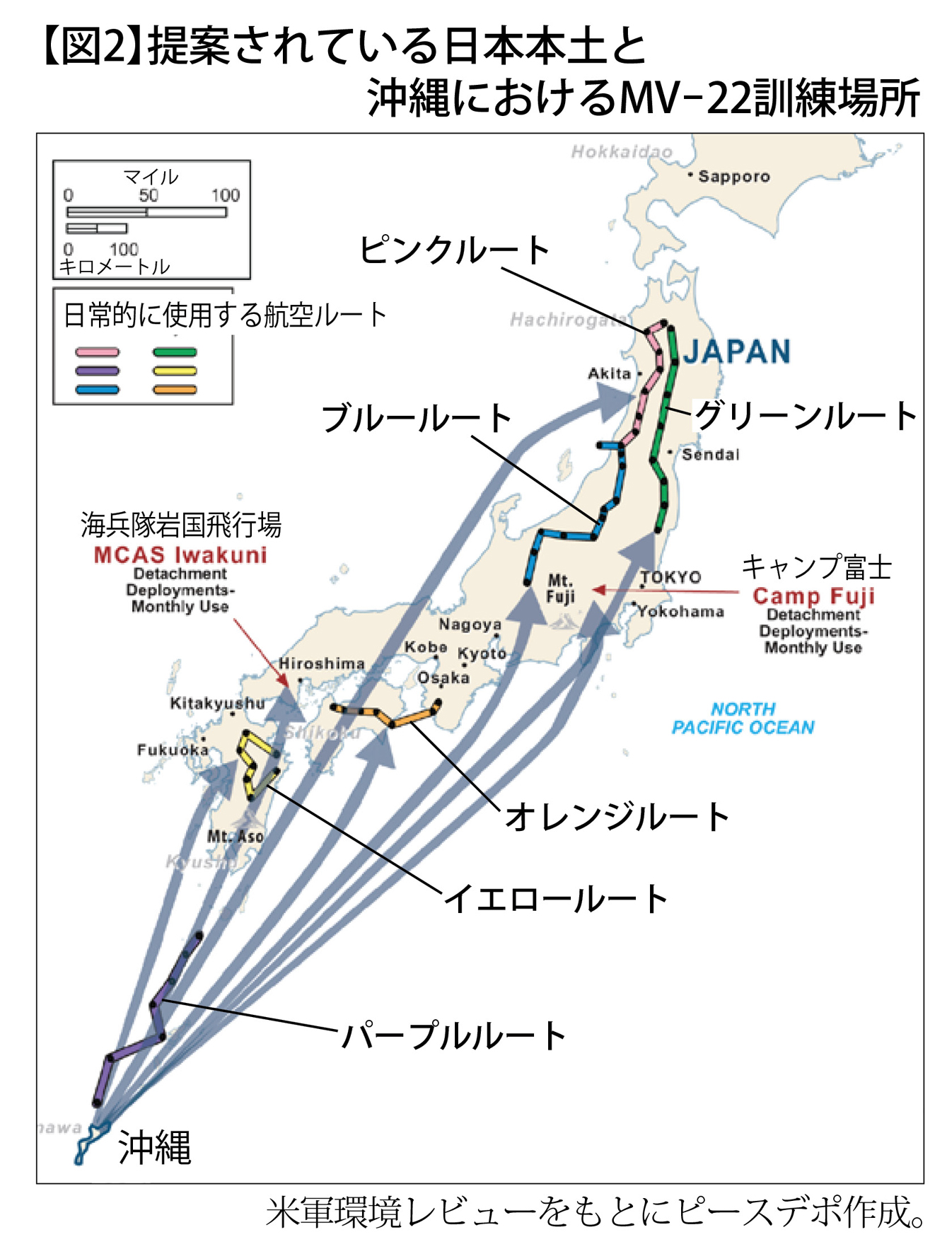 環境レビューは、沖縄のみならず、日本のほぼ全域で、オスプレイの飛行訓練を展開する計画を明らかにした(「要約」および「第2章」)。示された日本での飛行ルートは<図2>のとおりである。