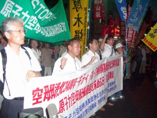 つづいて、主催者あいさつとして「原子力空母の横須賀母港問題を考える市民の会」の呉東正彦弁護士が、「渾身の怒りを込めて、この着工に抗議する」と強調。 横須賀港内の海底に含まれる水銀やヒ素などの有害物質の工事による拡散に加え、原子炉事故が起きた場合、165km内の住民の生命と健康に被害が及ぶことなどを指摘し、 「母港化を許せば50年以上にわたって恐ろしい原子炉事故の危険と同居しなくてはならない」と訴えました。 「原子力空母横須賀母港化を許さない全国連絡会」の藤本泰成事務局長(平和フォーラム副事務局長)につづいて、 連帯あいさつが、全国基地問題ネットワークの住友肇代表、岡本聖哉厚木爆同副委員長(大和市議)、福島瑞穂社民党党首などから行われました。