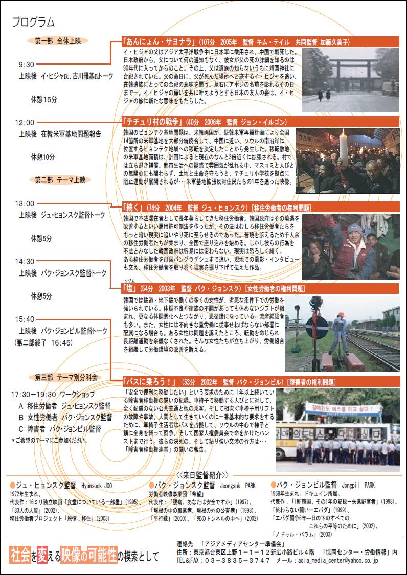 参加者280人。韓国での平和や人権・環境問題の様々なドキュメンタリー映像制作活動に触れながら、今後の日韓の市民レベルの交流のあり方を探ろうと、開催されました。靖国合祀問題を扱った「あんにょん・サヨナラ」、在韓米軍基地問題を取り上げた「テチュリ村の戦争」、移住労働者の暮らしを追った「続く」、女性労働者の権利と労働環境の改善を訴えた「塩(ソグム)」、障がい者の要求を見つめた「バスに乗ろう!」を上映しました。