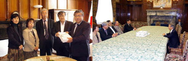 10月30日、平和フォーラムは国会を訪れ、衆議院副議長の横路孝弘さんと、参議院議長の江田五月さんに、「テロ特措法の廃止と海上自衛隊のインド洋からの撤退を求める緊急署名」約30万筆分を、提出しました。