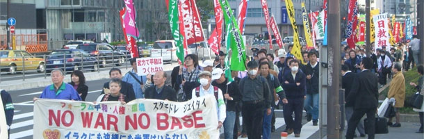 住民に多大な犠牲と被害をもたらしたイラク戦争が開戦して6年となる3月20日、イラクでは米軍撤退の動きが具体化する一方、 アフガンやパレスチナでつづく戦火。これに対して「イラク・アフガン・パレスチナに平和をWORLD PEACE NOW 3.20 武力で平和はつくれない」が、 東京・坂本町公園で行われ、約1000人が参加し、集会と日比谷公園までのデモを行いました。 集会は、学生時代に聞いたイラクの子どもたちの話が忘れられず、支援のボランティアに関わるようになったJlM-NET(日本イラク医療支援ネットワーク)スタッフが 大嶋愛さんの歌「人間をかえせ」(アメージップグレイスに峠三吉さんの詩をつけたもの)と 「青い空と白い鳩」(イラクの女の子が書いた詩をもとにしたもの)で開会。 パレスチナについて、ガザに光を!実行委員会から、パレスチナ子どものキャンペーン大河内秀人さんと JVC(日本国際ポランティアセンター・パレスチナ事業担当)の藤屋リカさん、 現地ガザを取材してきたフリージャーナリスト志葉玲さん。 アフガンについて、JVC(日本国際ボランティアセンター・アフガニスタン現地代表)の長谷部貴俊さん、 日本語で詩作しながら平和を訴える詩人のアーサー・ピナードさん、 横須賀原子力空母反対運動について小原慎一三浦半島地区労事務局長がスピーチを行いました。